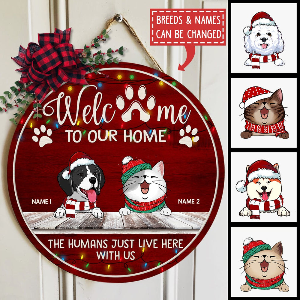 Welcome To Our Home The Humans Just Live Here With Us - Burgundy - Personalized Dog & Cat Christmas Door Sign